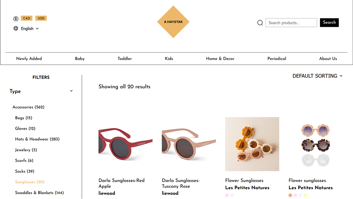 A Haystak was an aggregator for Canadian children's clothing and accessories. I created a custom WordPress theme to implement a provided graphic design, helped refine a category schema, and built extensive custom tools for importing and managing products in WooCommerce.