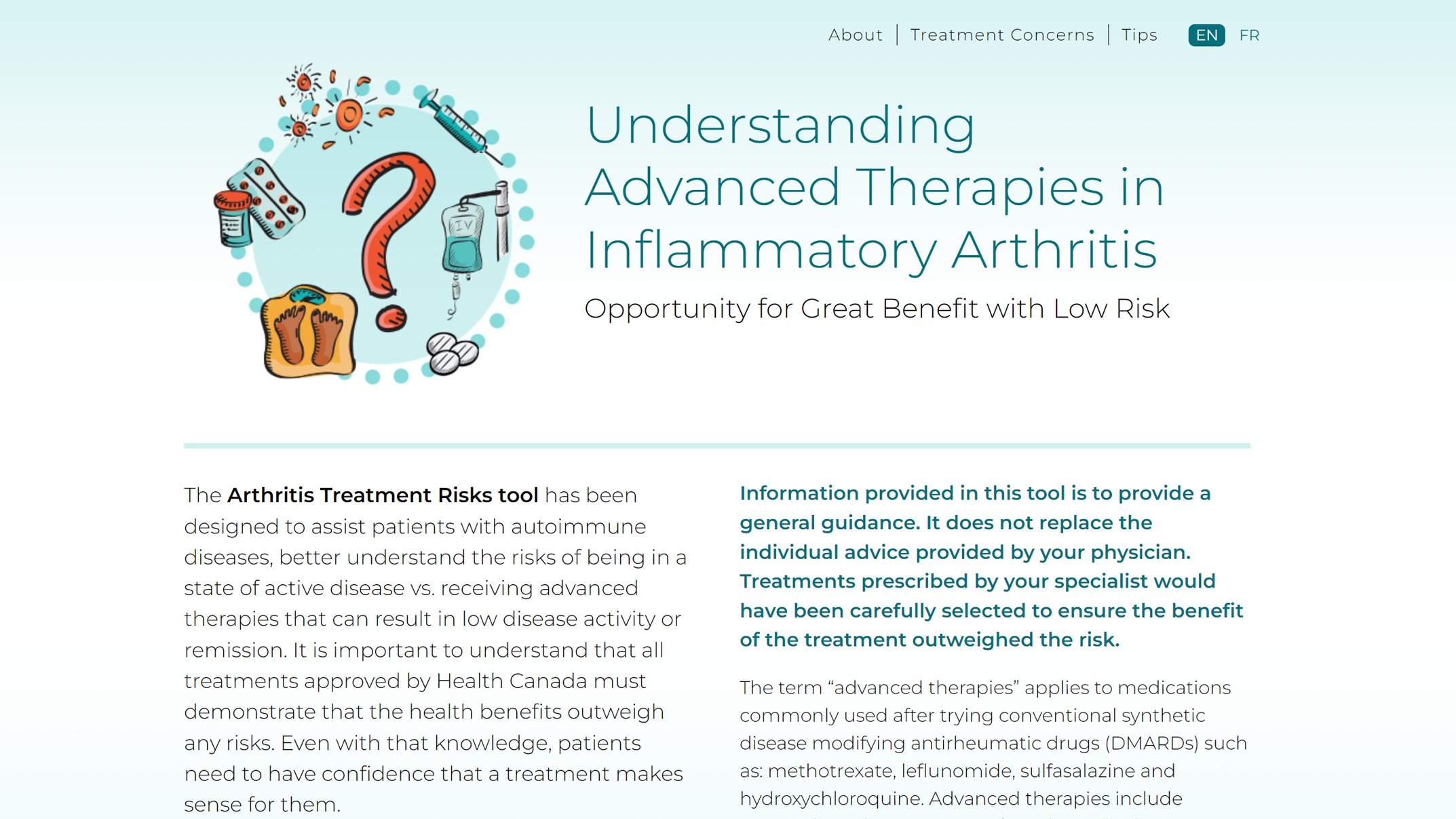 Working with designs from Design for Good, I implemented an online microsite for the Canadian Spondyloarthritis Association to help those with Inflammatory Arthritis obtain information about their care and treatment options. The tool dynamically generates customized PDF information sheets for users based on their personal needs and concerns.
