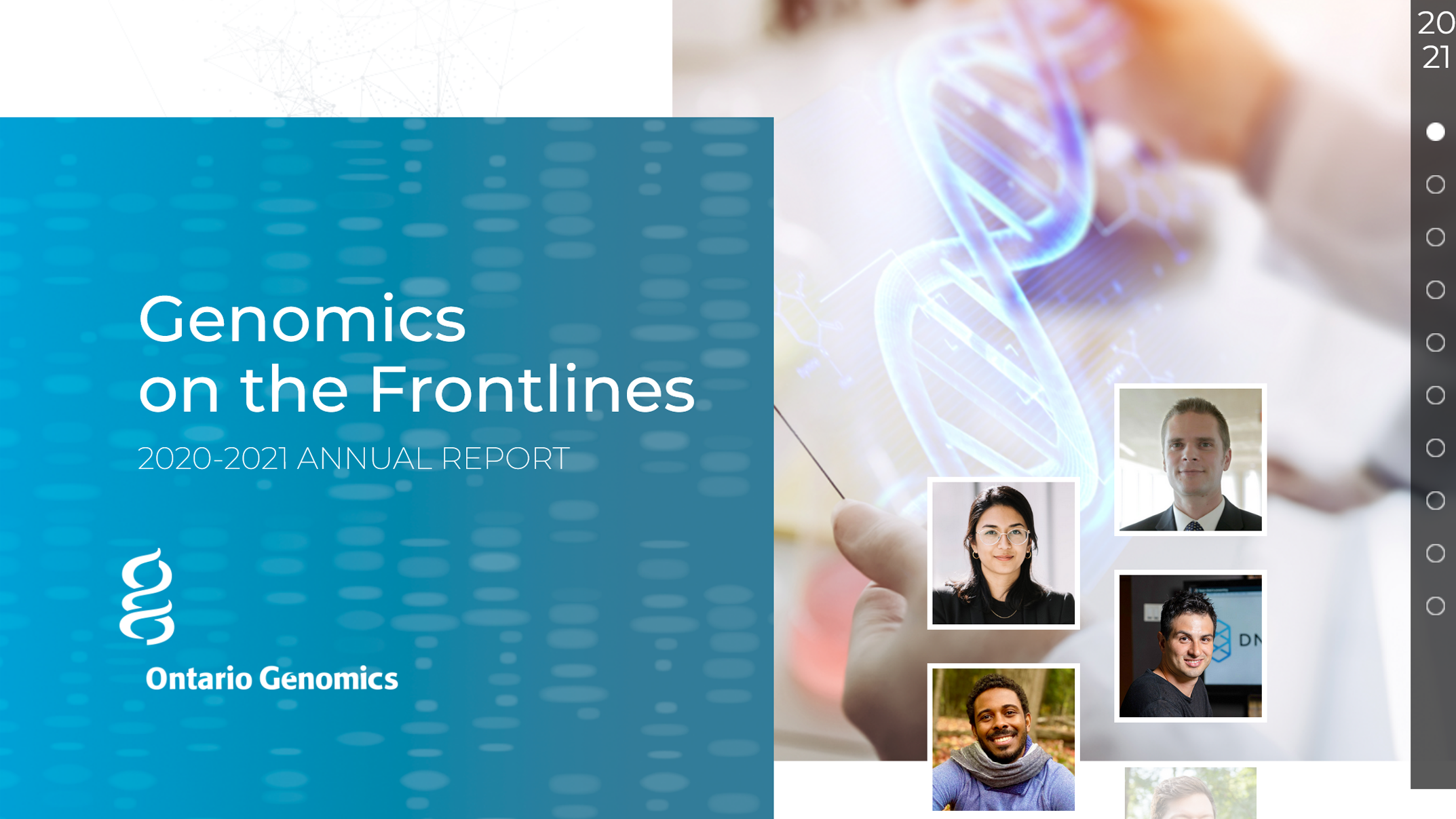 Working with designs provided by Swerve Design, I implemented a static single-page website to display the 2021 annual report for Ontario Genomics, a not-for-profit organization that supports genomics research. The website makes creative use of animation and data visualization to present precise and detailed information in an appealing way.